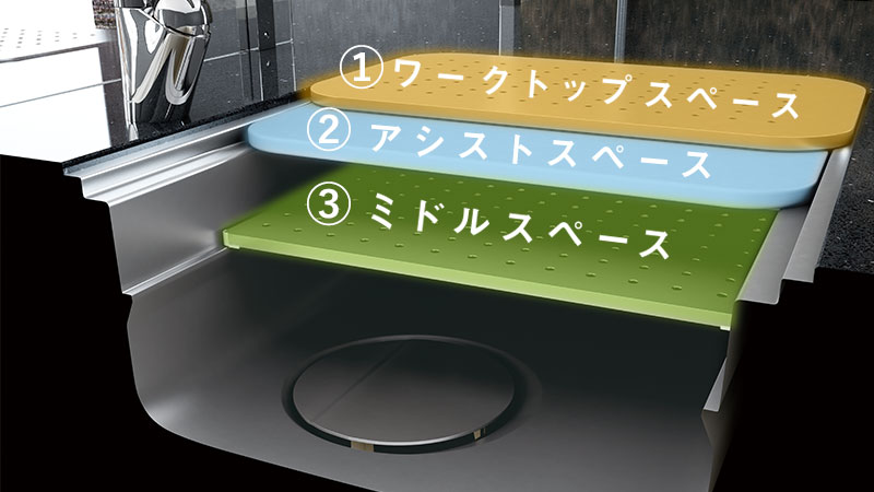 3層シンクで、洗う・調理・片付けがスムーズにできるスペースが確保された実用性の高いシンクとなっています。